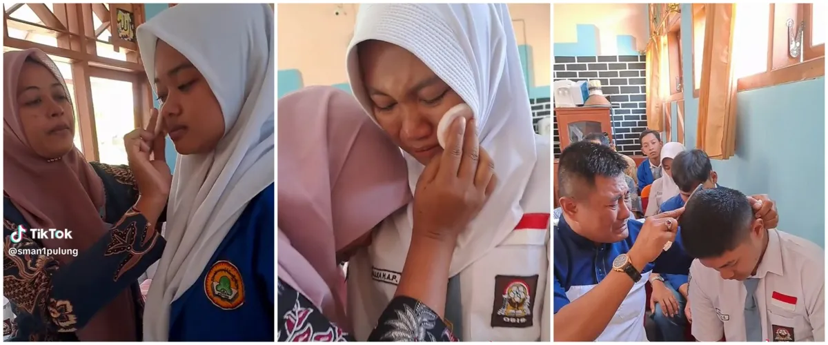 Banyak orang tua dan siswa yang tak sanggup membendung air mata. Mata para ibu dan ayah berkaca-kaca, seolah kilasan masa lalu sewaktu membersarkan anaknya muncul di kepala. Tidak sedikit juga yang akhirnya berpelukan sambil menguatkan satu sama lain.