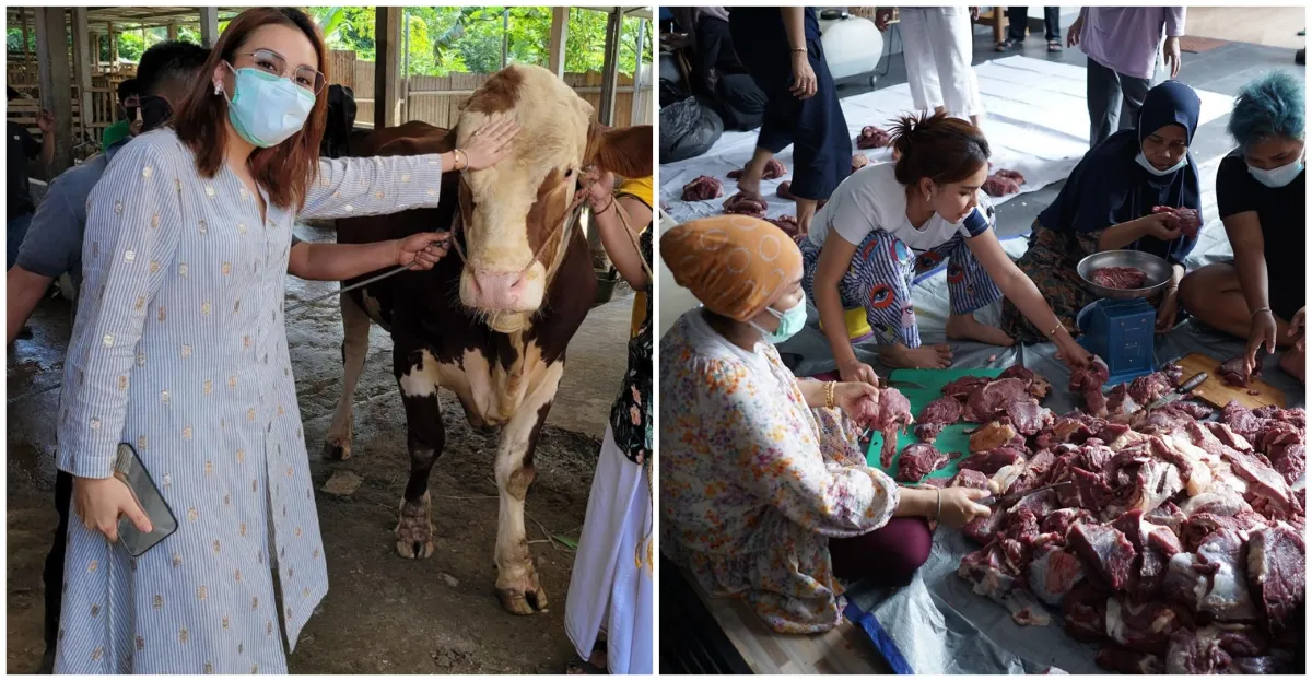 Tak hanya itu, Ayu juga turun langsung dalam pemotongan daging sapi yang telah ia kurbankan.