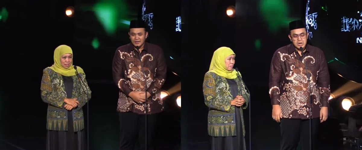 Gilang ditemani Khofifah Indar Parawansa saat di atas panggung. Keduanya sempat berbincang sedikit terkait keberadaanya di panggung tersebut.